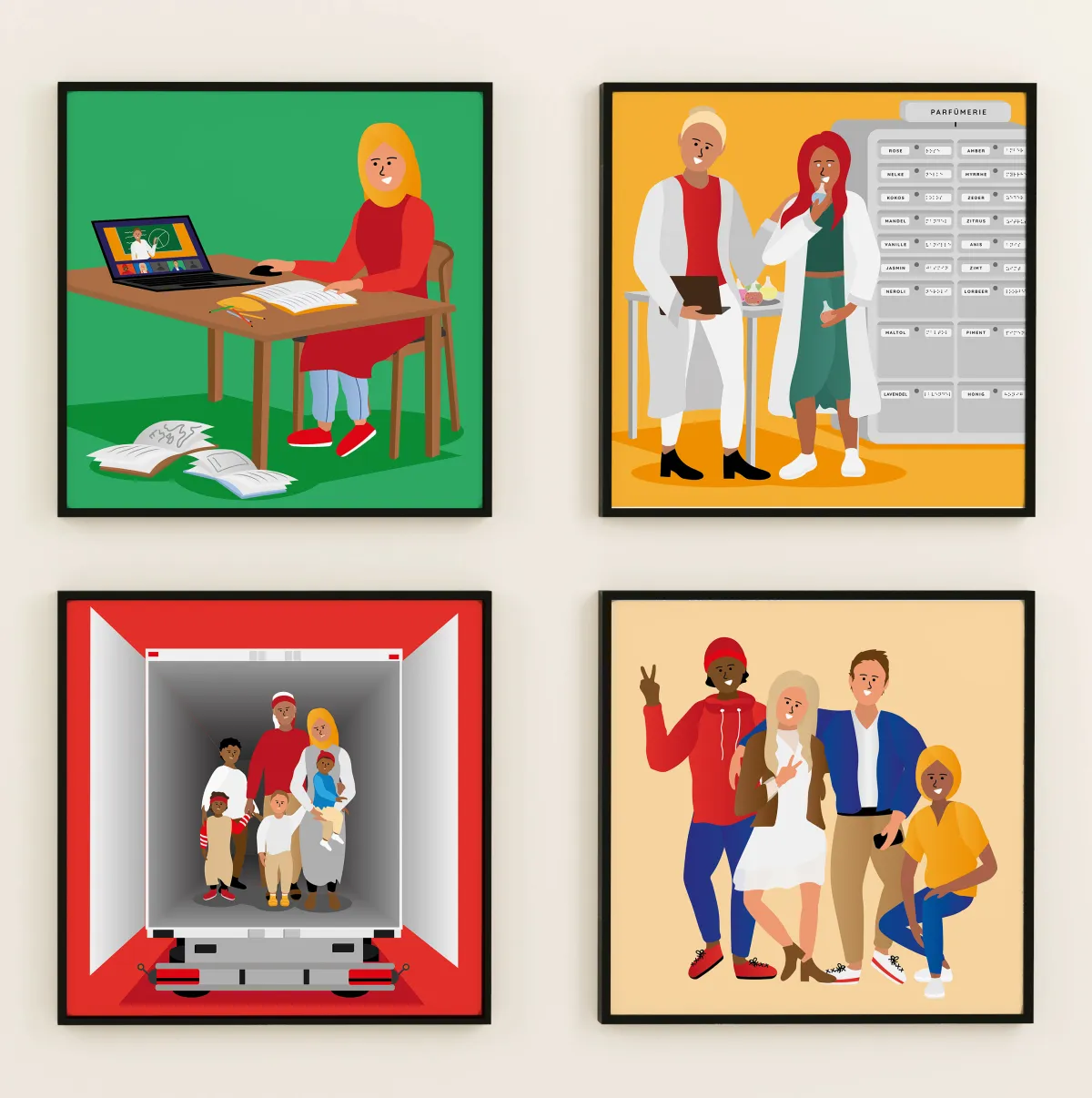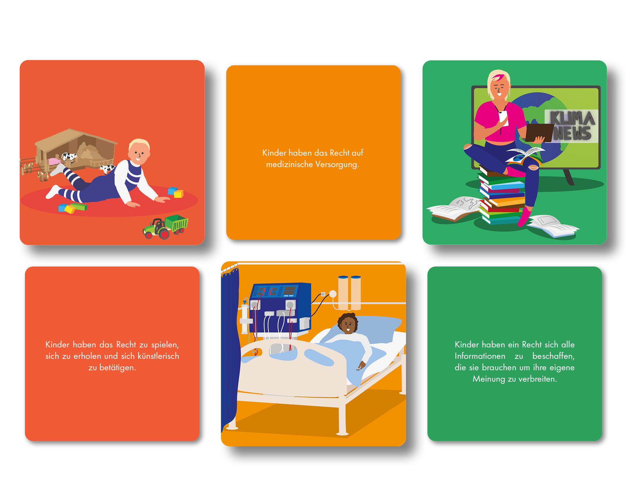 Mit einfachen Formen, klaren Farben und zugänglichen Illustrationen zeigen die Motive die UN-Kinderrechte – spielerisch, ehrlich und ohne zu überfordern.